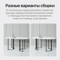 Подстолье, состоящее из двух ножек-полумесяцев, изготовлено из металла (высококачественная сталь) с устойчивой (двойной) порошковой окраской. Столешница выполнена из ЛДСП высокого качества Egger. Толщина столешницы - 25 мм.