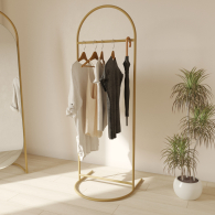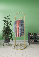 Оригинальная дизайнерская стойка для одежды ручной работы – идеальное решение для гардеробных загородных домов, прихожих квартир, примерочных бутиков одежды, специализированных отделов супермаркетов. Она выполнена в виде прочной металлической рамы, отличаются удобством и практичностью. Устойчивость этой модели рейла обеспечивает достаточно большое по площади основание, к которому жёстко прикреплена рама. При этом изделие немного весит, что позволяет с лёгкостью переставлять конструкцию с места на место.