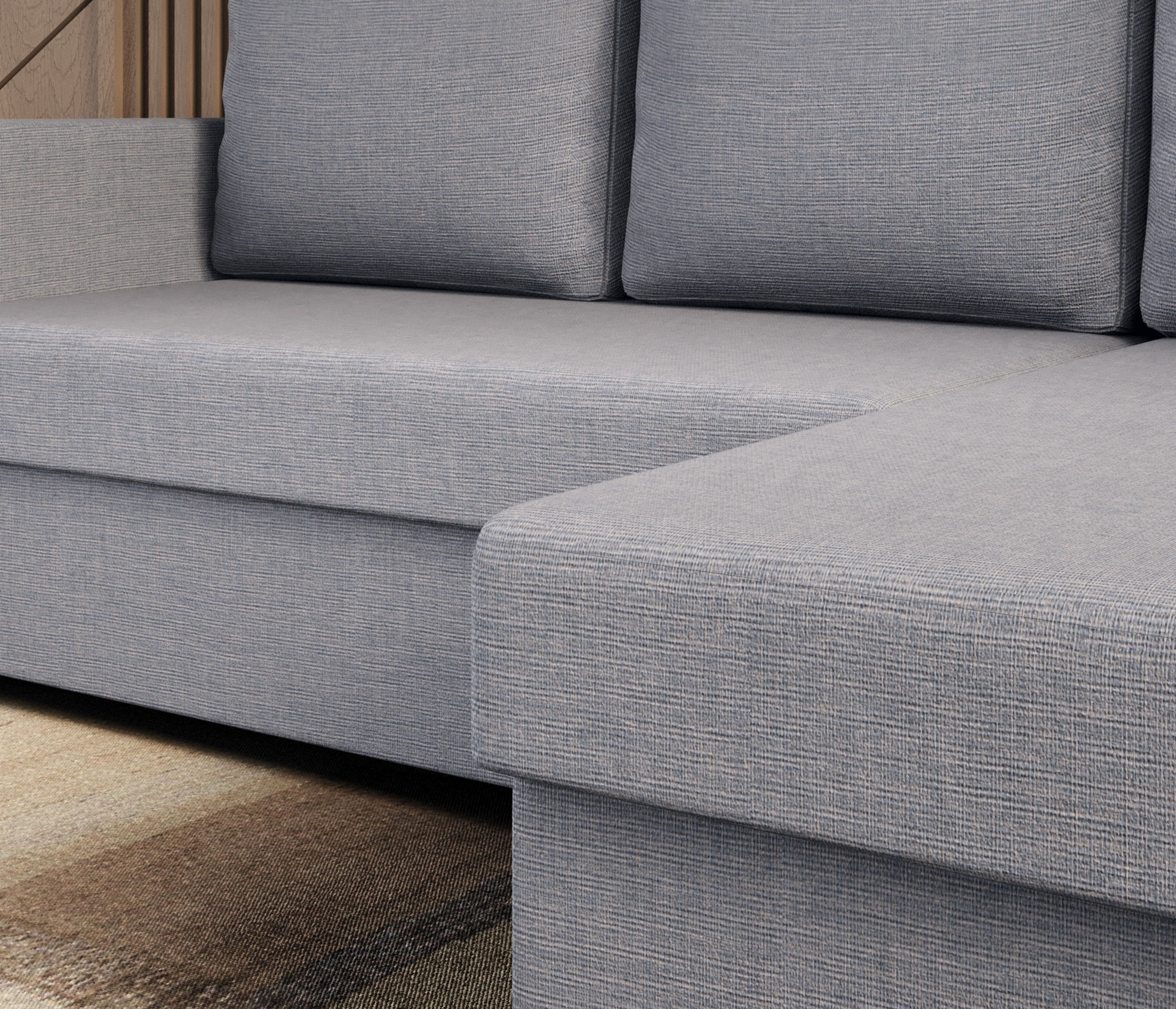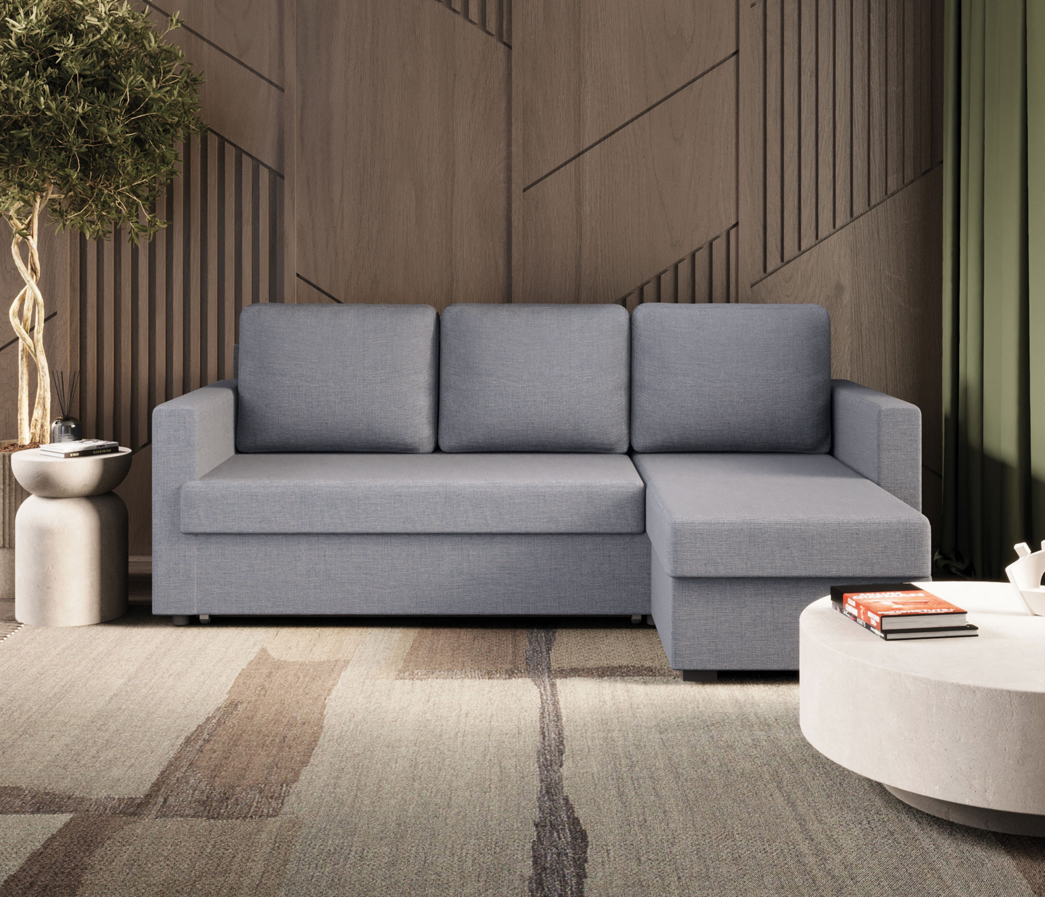 Стильный и практичный угловой диван «Джессика» с выкатным механизмом трансформации «Дельфин» и вместительным бельевым ящиком станет центральным элементом зоны отдыха в интерьере, созданном популярном стиле «скандинавский минимализм», который основан на гармоничном сочетании простоты, практичности, обилия света, комфорта и функциональности. Поэтому здесь нет вычурного декора, а только прямые линии, мягкая, сдержанная цветовая гамма, обивка под «мешковину» и угловая геометрия, позволяющая рационально использовать пространство и исключающая необходимость приобретать дополнительные места для сиденья.